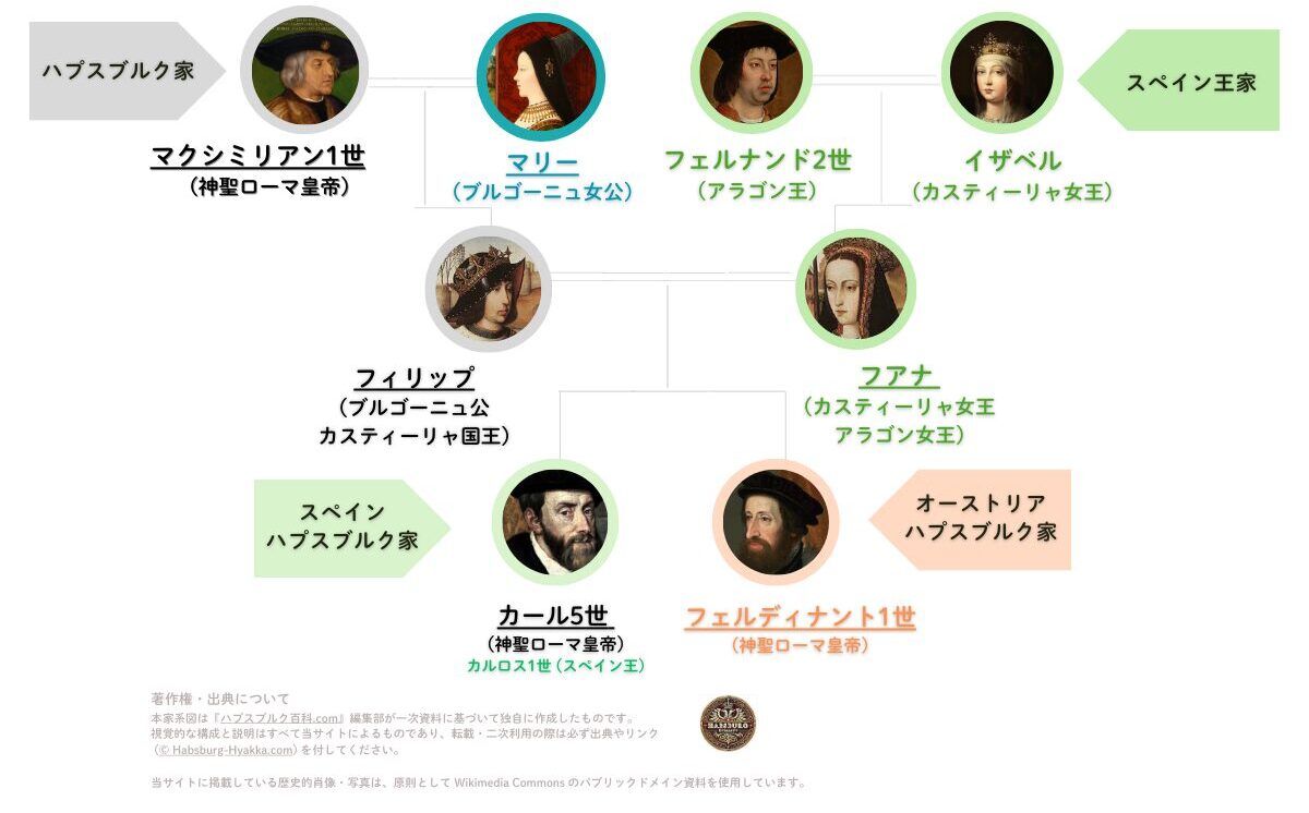 マクシミリアン1世が、ブルゴーニュの女公マリーと政略結婚を果たすと、豊かなネーデルラントが手に入った。さらにその息子フィリップはスペイン王女フアナと結婚。